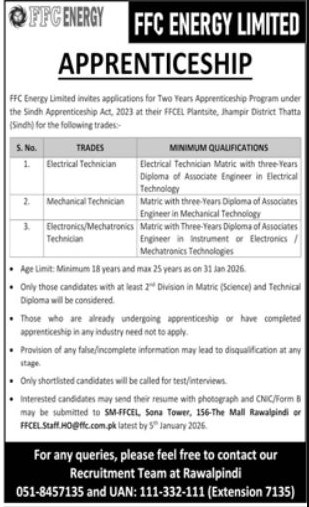 Candidates if you are seeking FFC Energy Limited Jobs In Rawalpindi December 2025 if yes. It would be best if you tried to complete read this FFC Energy Limited job because you can easily apply for these vacanciesElectrical Technician Mechanical Technician Electronics/Mechatronics Technician. Only male candidates can apply for FFC Energy Limited Jobs In Rawalpindi December 2025 Qualification /Experience Required:Electrical Technician Matric with three Years Diploma of Associate Engineer in Electrical Technology Matric with three-Years Diploma of Associates Engineer in Mechanical Technology, and more experienced candidates should apply before 0December 2025.